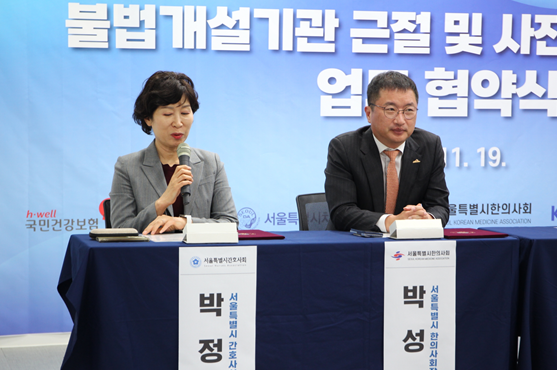 회의에 앞서, 서울시간호사회는 건보공단과 함께 ‘불법개설기관 근절 및 사전 예방을 위한 업무협약(MOU)'을 서울시치과의사회·한의사회·약사회와 공동 체결했다. 이번 협약은 불법 의료기관의 예방과 근절을 위한 협력 체계를 구축하고, 관련 대응을 강화하기 위해 마련되었다.