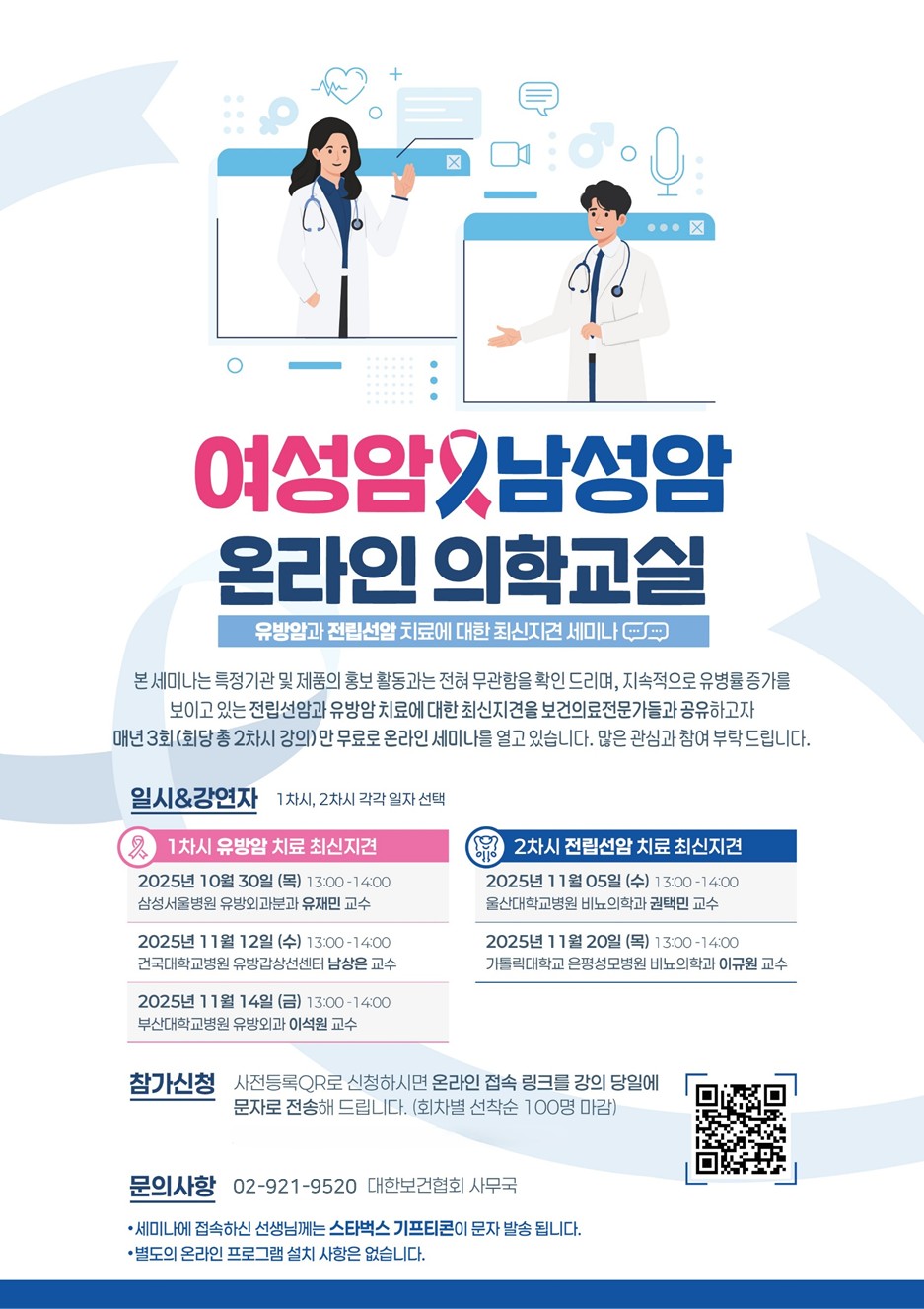 [대한보건협회-업무협조] 여성암, 남성암 온라인 의학교실 무료 온라인 세미나 개최