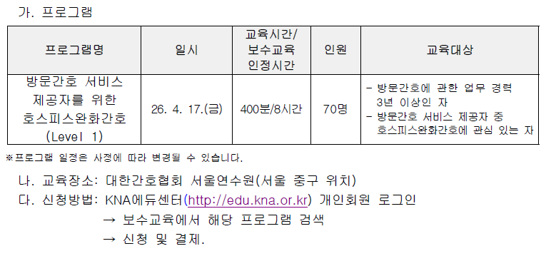 대한간호협회는 간호사의 역량 강화를 위하여「방문간호 서비스 제공자를 위한 호스피스완화간호(Level 1)」보수교육 프로그램을 개발, 운영하고 있습니다. 이에 귀 기관의 간호사가 참석할 수 있도록 협조하여 주시기 바랍니다.